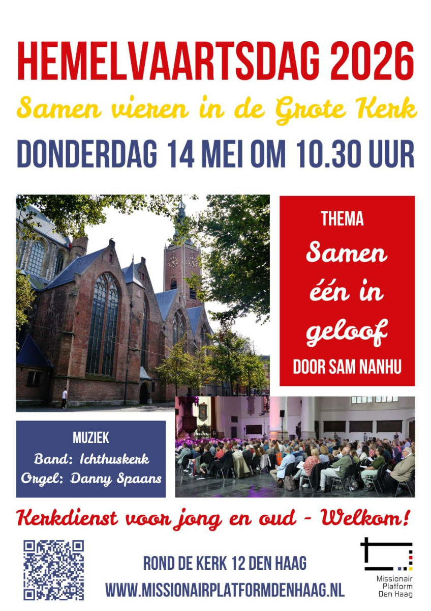 ![]() Op donderdag 14 mei 2026 om 10.30 uur wordt er voor het vierde opeenvolgende jaar een Hemelvaartsviering gehouden in de Grote Kerk in Den Haag. Samen met honderden christenen van kerken uit Den Haag, Rijswijk en Leidschendam-Voorburg staan we die dag stil bij de hemelvaart van Jezus. In de Christus Triumfatorkerk is op Hemelvaartsdag geen kerkdienst. | ||