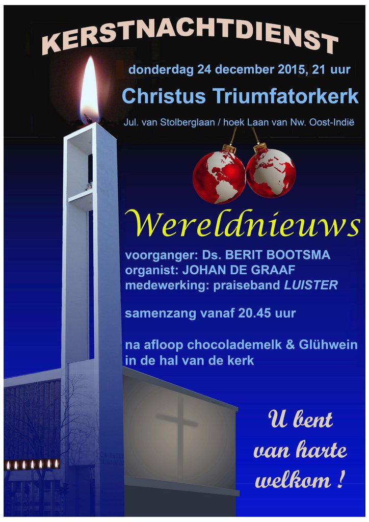 donderdag 24 december 2015 om 21.00 uurKerkdienst - KerstnachtdienstVoorganger(s): ds. Berit Bootsma Organist: Johan de Graaf Wilt u opgehaald worden omdat u slecht ter been bent: bel Wouter Muller - tel. 070 386 16 42 Donderdag 24 december is om 21.00 uur de kerstnachtdienst. Het thema van de dienst is ‘Wereldnieuws’ en als ondertitel ‘Licht en Hoop’. Afgelopen jaar was een jaar waarin we veel wereldnieuws over ons heen kregen. Is de komst van Jezus ook in onze tijd nog wereldnieuws? In deze nacht ontsteken we het licht van de hoop. Kwetsbare vlammen die met elkaar de nacht kunnen verlichten.